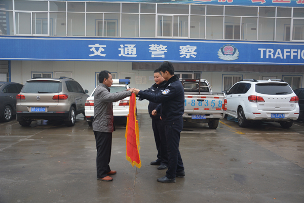 2017年1月6日上午,车主樊女士的丈夫王先生拿着“忠于职守 廉洁奉公”的锦旗走进了庆城公安交警大队事故中队,将锦旗送到了办案民警蔡永博、闫盛洲的手中,衷心地感谢事故中队民警的热情周到、尽职尽责,为民着想、执法公正,并快速查获交通肇事逃逸违法嫌疑人。