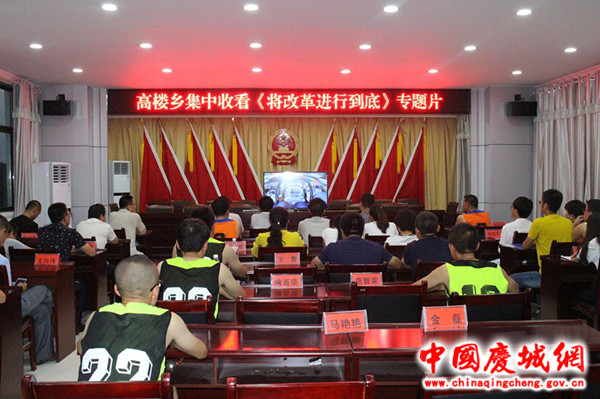 7月17日晚8时,迎接党的十九大电视专题片《将改革进行到底》开播,高楼乡组织党员干部集中收看。