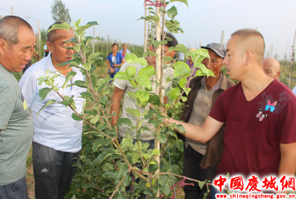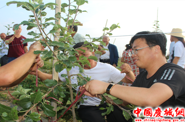 观摩学习中,各兄弟乡镇负责人对先进示范园的管理方法、推广经验、经济效益等方面进行了认真讲解;果园管理能手介绍了自己建园、管园的办法和经验;随后,在曹塬村开展了现场教学,参观团全体成员实地上手操作压枝、揉枝等实用技能。
