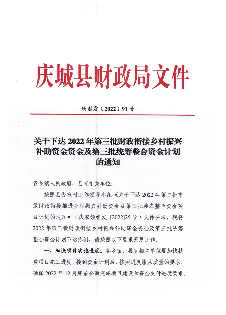 索引号: 621021/2022-00015 发布机构: 生效日期: 2022-08-29 废止日期: 文 号: 庆财发【2022】91号 所属主题: 部门文件 关于下达2022年第三批财政衔接乡村振兴补助资金资金及第三批统筹整合资金计划的通知 来源:庆城县财政局 发布时间:2022-08-29 浏览次数: 次 【字体:小 大】 【打印正文】 分享到: 【字体:小 大】