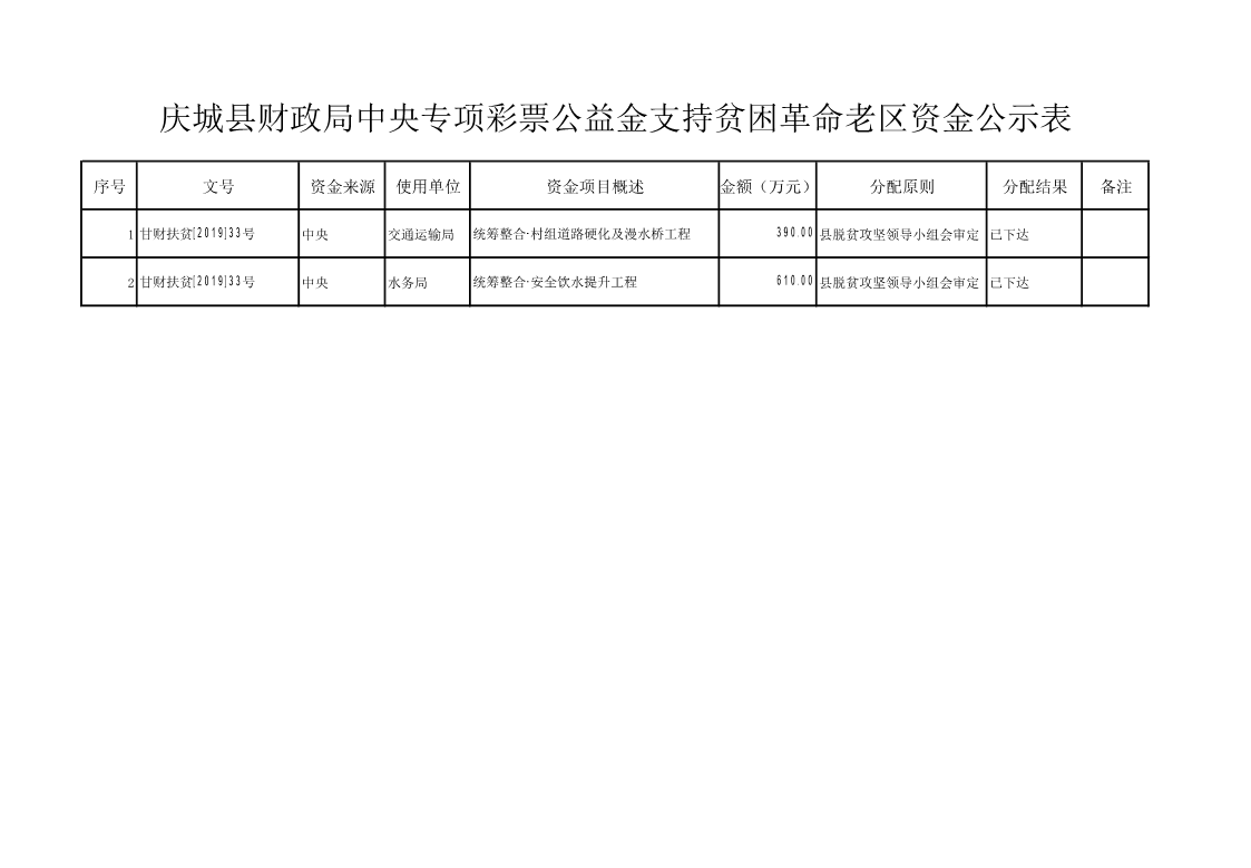 索引号: QC-CZJ-2020-00002 发布机构: 财政局 生效日期: 2020-04-30 废止日期: 文 号: 所属主题: 部门文件 庆城县财政局中央专项彩票公益金支持贫困革命老区资金公示表 来源: 发布时间:2020-04-30 浏览次数: 次 【字体:小 大】 【打印正文】 分享到: 【字体:小 大】