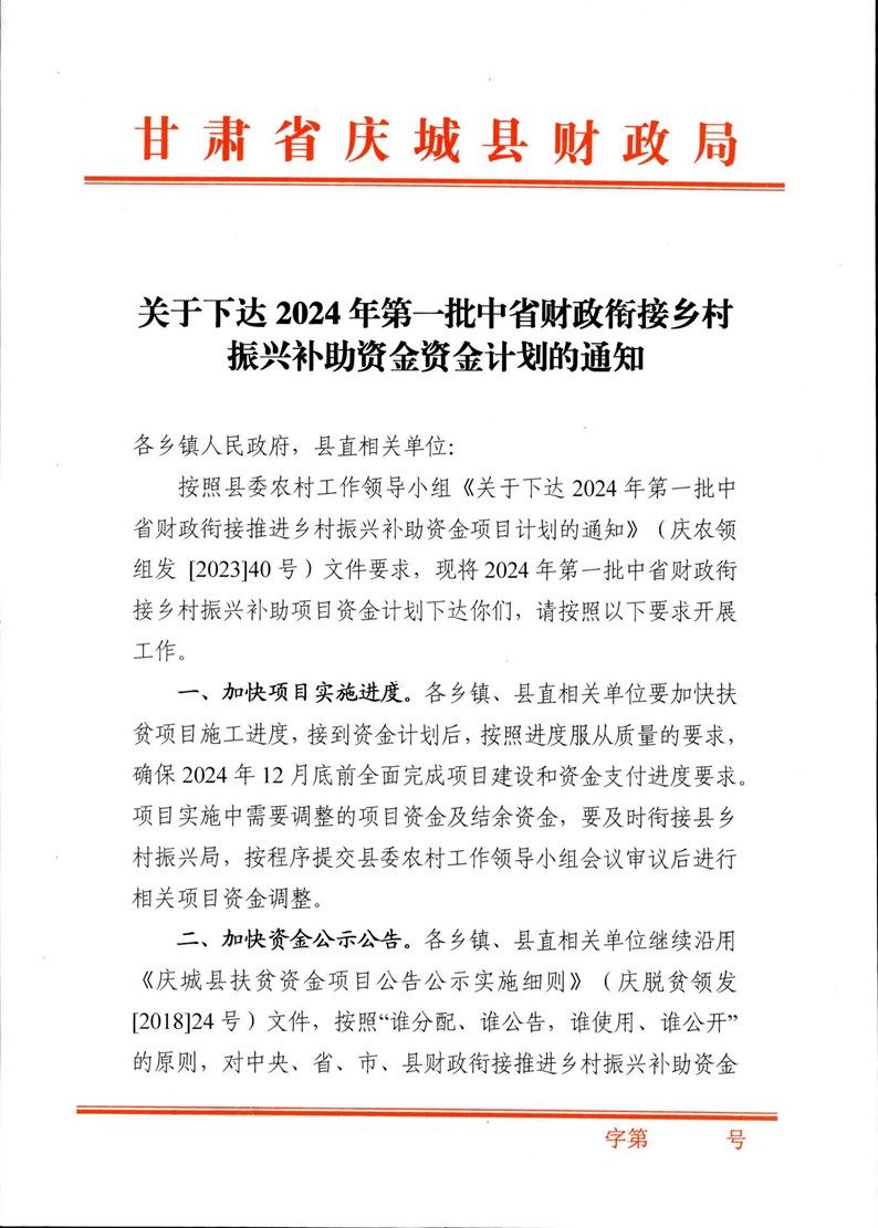 索引号: 621021/2024-00066 发布机构: 生效日期: 2024-01-02 废止日期: 文 号: 所属主题: 乡村振兴资金公示 关于下达2024年第一批中省财政衔接乡村振兴补助资金资金计划的通知 来源: 发布时间:2024-01-02 浏览次数: 次 【字体:小 大】 【打印正文】 分享到: 【字体:小 大】