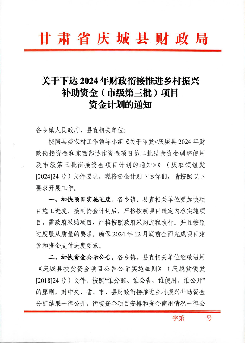 索引号: 621021/2024-000070 发布机构: 生效日期: 2024-12-25 废止日期: 文 号: 所属主题: 乡村振兴资金公示 关于庆城县2024年财政衔接推进乡村振兴补助资金(市三批)计划的公示 来源: 发布时间:2024-12-25 浏览次数: 次 【字体:小 大】 【打印正文】 分享到: 【字体:小 大】